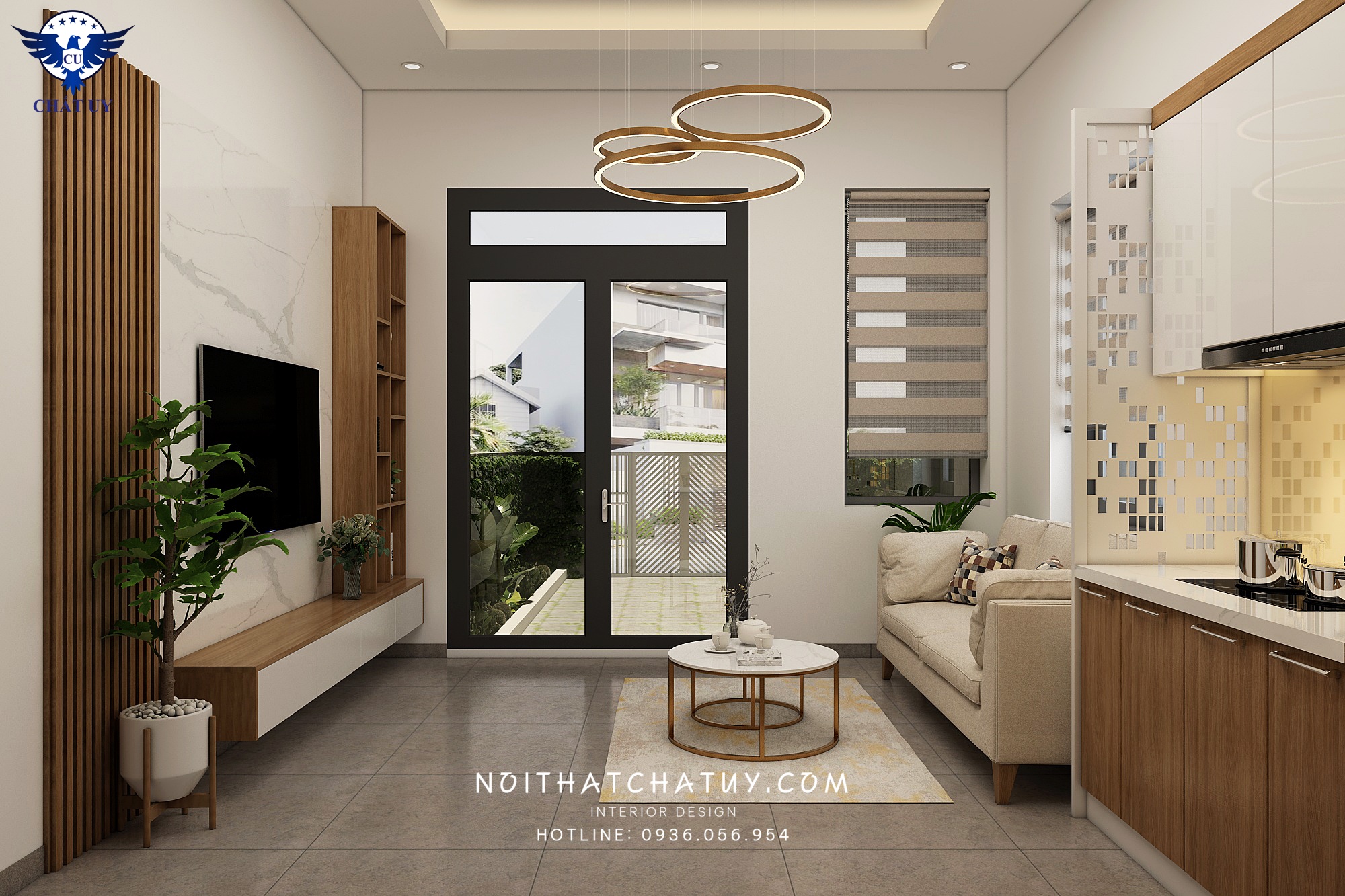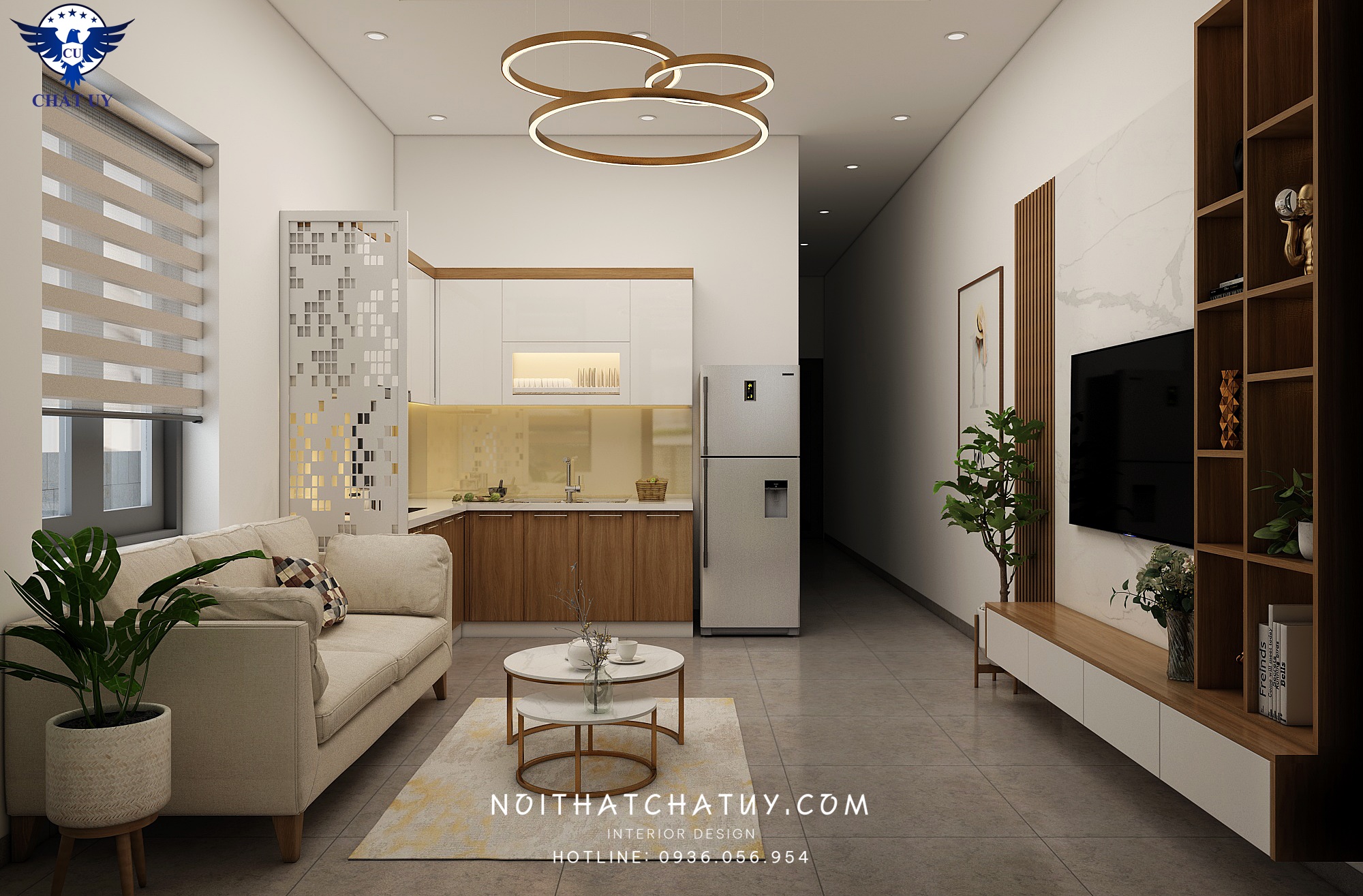 Để tận dụng diện tích, kiến trúc sư tại Chất Uy đã kết hợp thiết kế phòng khách và phòng bếp cùng một không gian. Thiết kế này không những độc đáo, gọn gàng mà còn mang lại nhiều tiện nghi khi sử dụng.