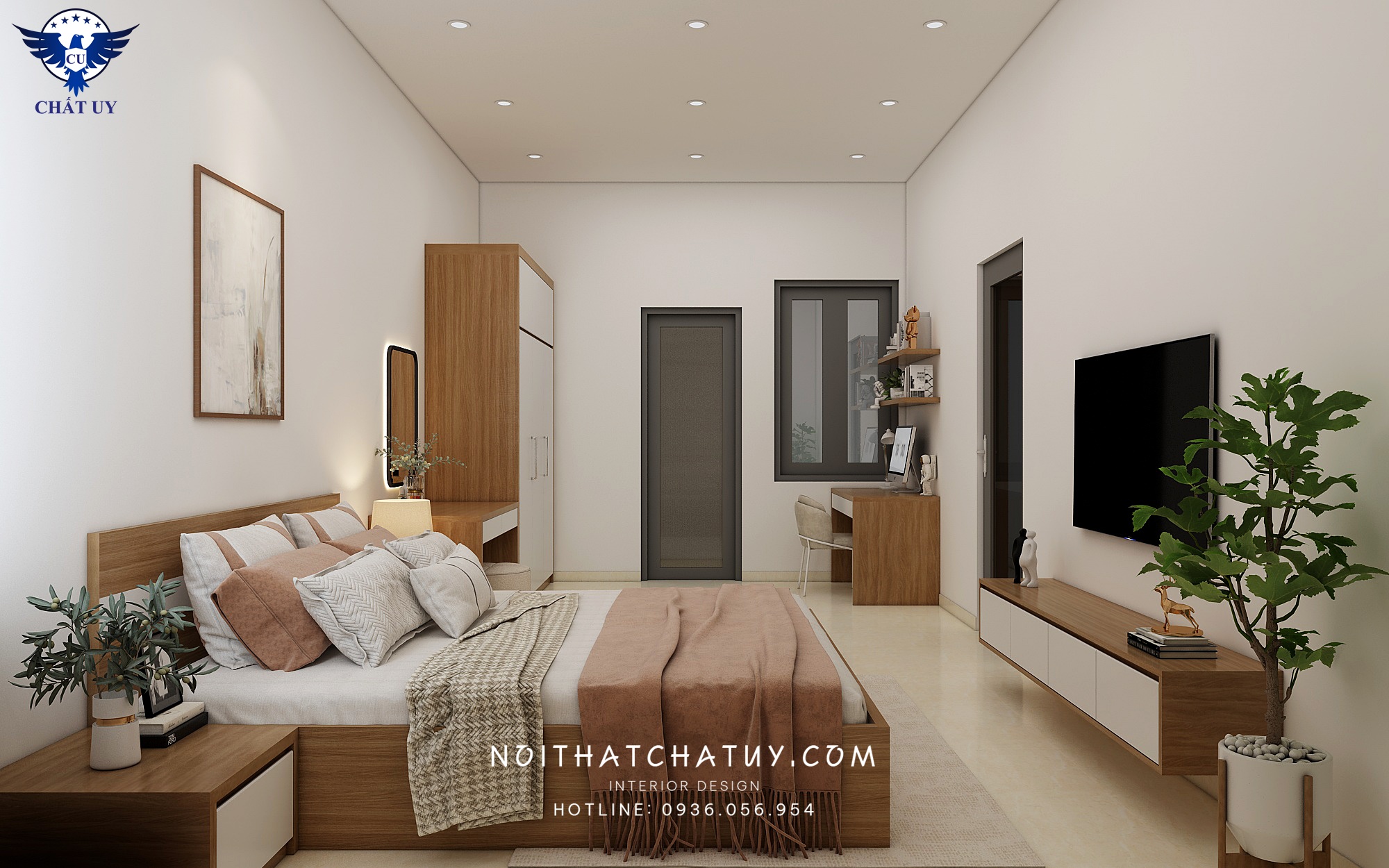 Phòng ngủ được Thiết kế nhà 24h trang bị rất chi tiết bao gồm một giường ngủ thiết kế chắc chắn, một tủ quần áo rộng cùng một bàn ghế trang điểm giúp chị em có không gian thoải mái sử dụng vào những lúc cần thiết.