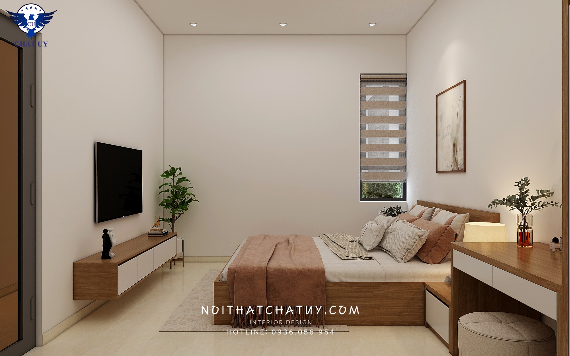 Để tiện cho việc xem thông tin, các chương trình truyền hình mà không cần phải di chuyển ra phòng khách, thì phòng ngủ của nội thất chung cư anh An còn được trang bị thêm một chiếc tivi treo tường cũng như một kệ tủ nhỏ giúp anh chị có thể đặt, đựng đồ cá nhân.