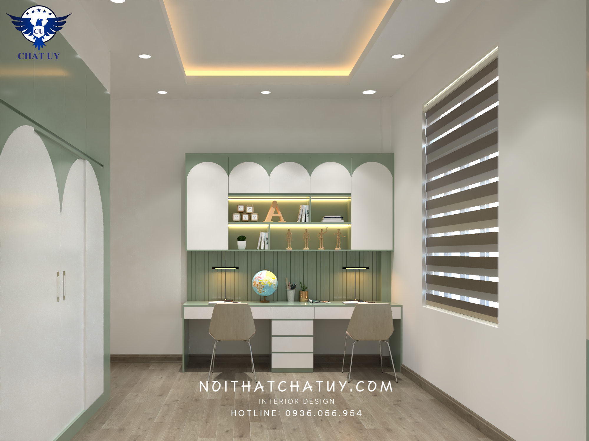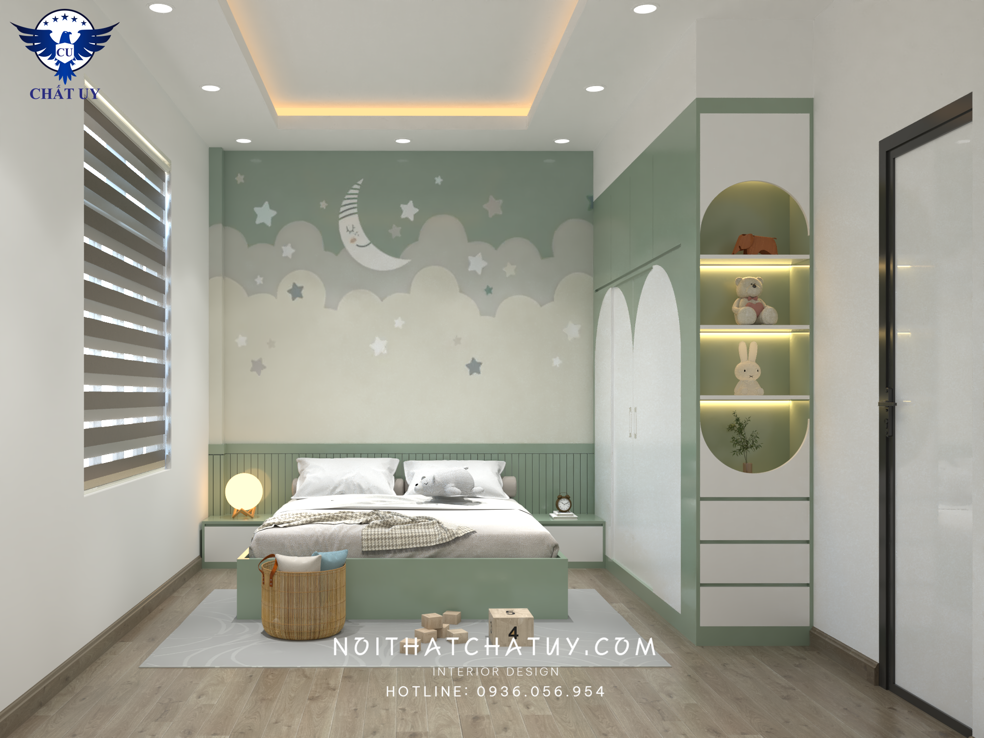 Trong khi đó, với không gian phòng ngủ cho trẻ nhỏ, tông màu xanh mint và trắng chính là sắc màu chủ đạo. Sự kết hợp hài hòa này giúp căn phòng dễ chịu, nhìn xinh xắn và dễ thương. Thay vì sử dụng sàn đồng màu với nội thất như ở phòng ngủ người lớn, ở không gian này các kiến trúc sư đã chọn tông màu nâu xám khác biệt giúp căn phòng trở nên sáng hơn và mang một năng lượng tích cực, tươi mới.